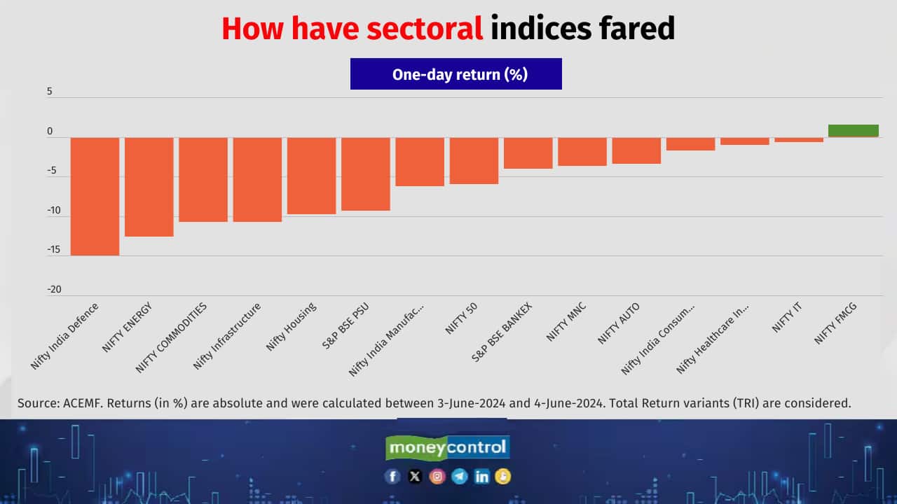 The Indian stock market crashed on June 4 with the benchmark indices experiencing their sharpest single-day fall since March 2020, as investors turned jittery after the BJP failed to secure a majority on its own in the Lok Sabha election 2024. The Sensex closed 5.7 percent down, while the Nifty plunged 5.9 percent. Mid and small-cap indices, too, tanked. The Nifty midcap 150 and Nifty smallcap 250 ended 7.1 percent and 7.5 percent down. Equity mutual funds followed suit. While experts advise investors not to be swayed by short-term gyrations and focus on long-term goals, here’s a list of schemes in the major equity categories which saw the sharpest one-day fall on June 4:
