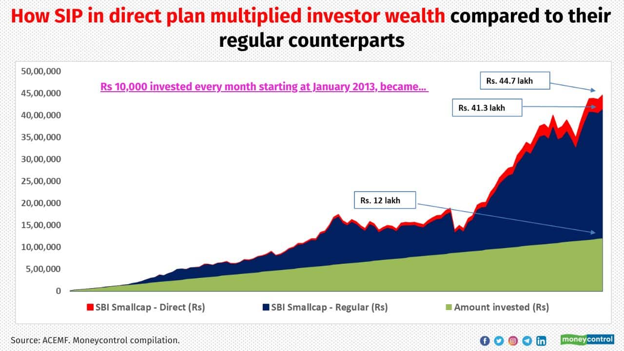 Under direct plans, the commission paid to intermediaries is excluded from the expenses charged to investors, thus leading to a difference in expense ratios. ACEMF data shows that the difference between the average expense ratio of direct plans and regular plans was in the range of 39 bps to 74 bps. One basis point is equivalent to 0.01% (1/100th of a percent). Eventually, the difference is what the direct investors tend to get extra in return