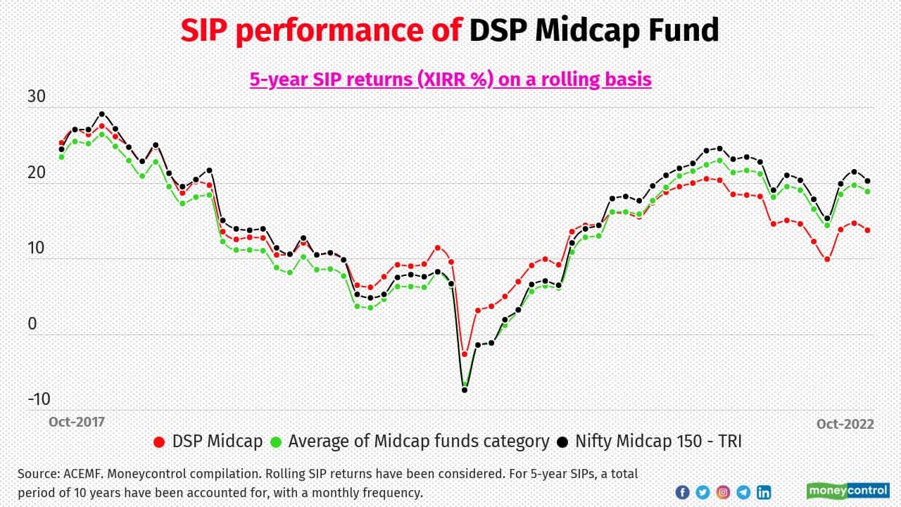 DSP Midcap Fund Category: Midcap Fund manager: Vinit Sambre, Resham Jain and Abhishek Ghosh Average 5-year SIP return (XIRR) of the scheme over the last 10 years: 14.5% Average 5-year SIP return (XIRR) of the midcap category over the last 10 years: 13.8% A larger corpus in the midcap segment has been one of the deterrent factors for DSP Midcap Fund delivering relatively better returns over the last year.