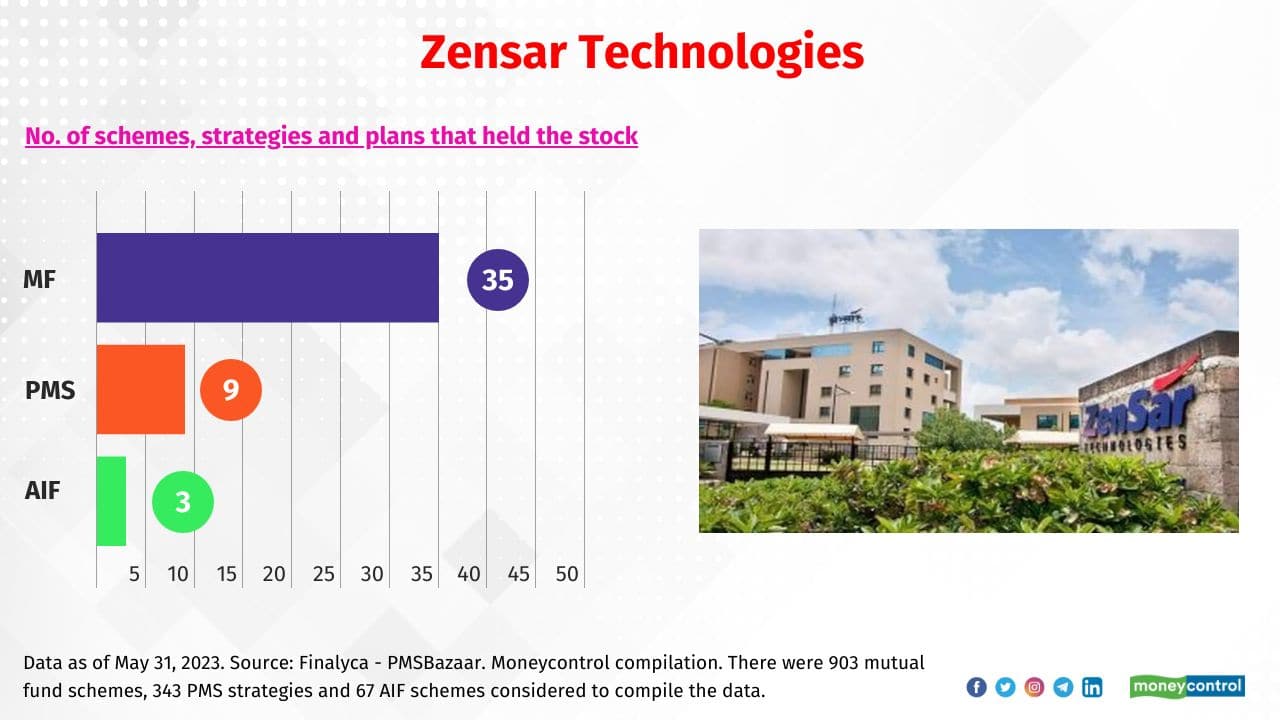 Zensar Technologies Total no. of MFs, PMSs, and AIFs that held the stock: 47. Sample of MFs that held the stock: Franklin India Technology and Bandhan Multi Cap. Sample of PMSs that held the stock: Carnelian Capital - Shift Strategy and Composite India - Emerging Star. Sample of AIFs that held the stock: Incred-Emerging Business and Carnelian Capital Compounder Fund–1.