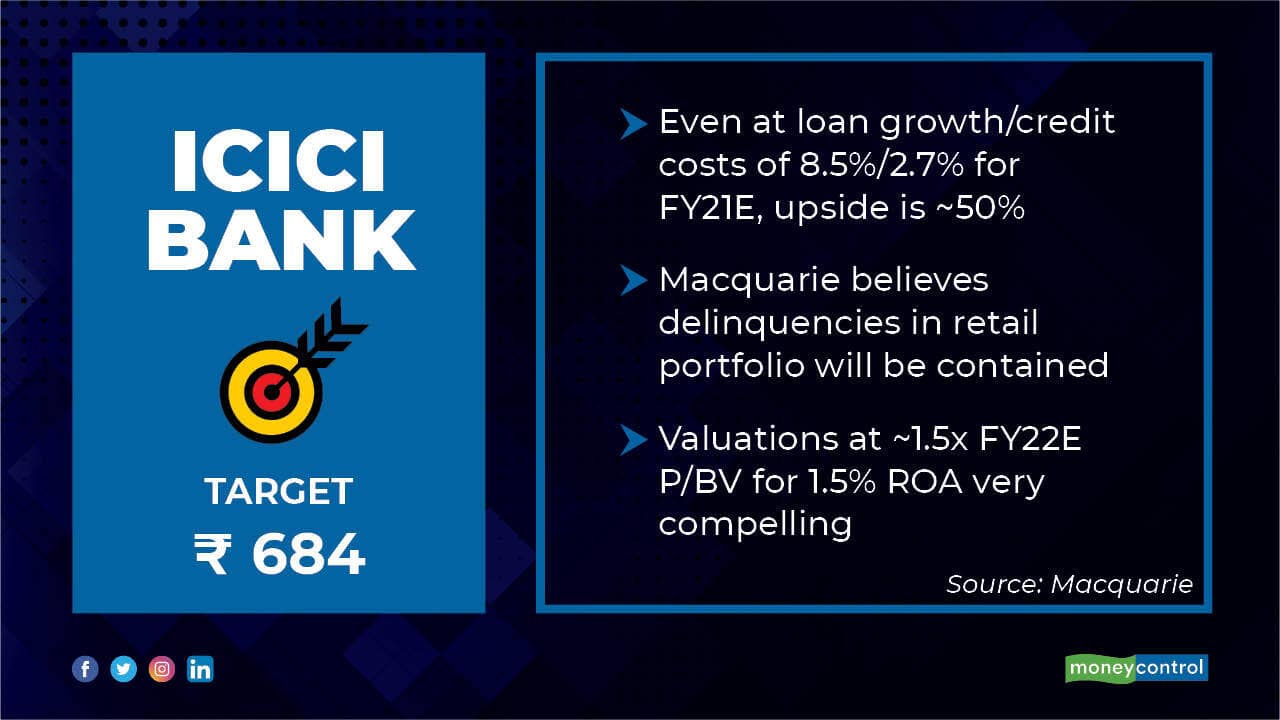 ICICI Bank | “Even after factoring in loan growth / credit costs of 8.5 percent / 2.7 percent for FY21E in our bear case scenario (post COVID) the stock offers upside of ~50 percent today,” Macquarie said. (Image: Moneycontrol)