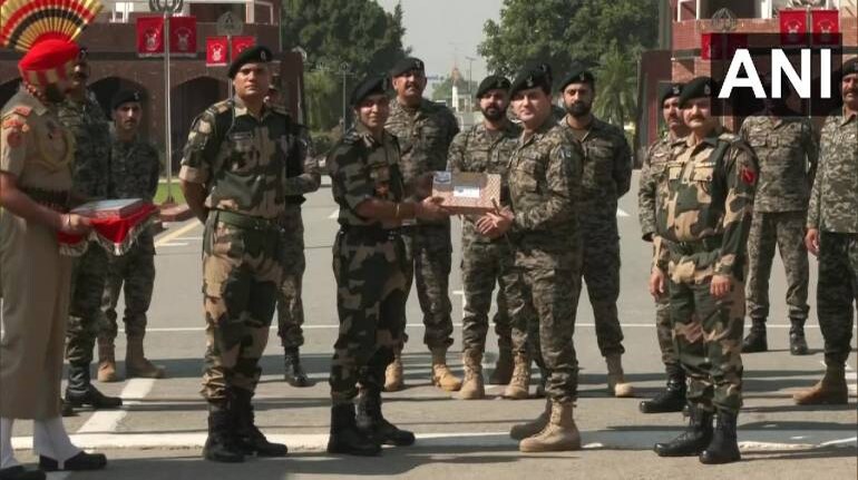 India’s Border Security Force (BSF) exchanged sweets with Pakistan rangers at the Attari-Wagah border and with Border Guard Bangladesh (BGB) at West Bengal’s Fulbari on the India-Bangladesh Border, on the occasion of Diwali, on October 24. (Image: Twitter @ANI)