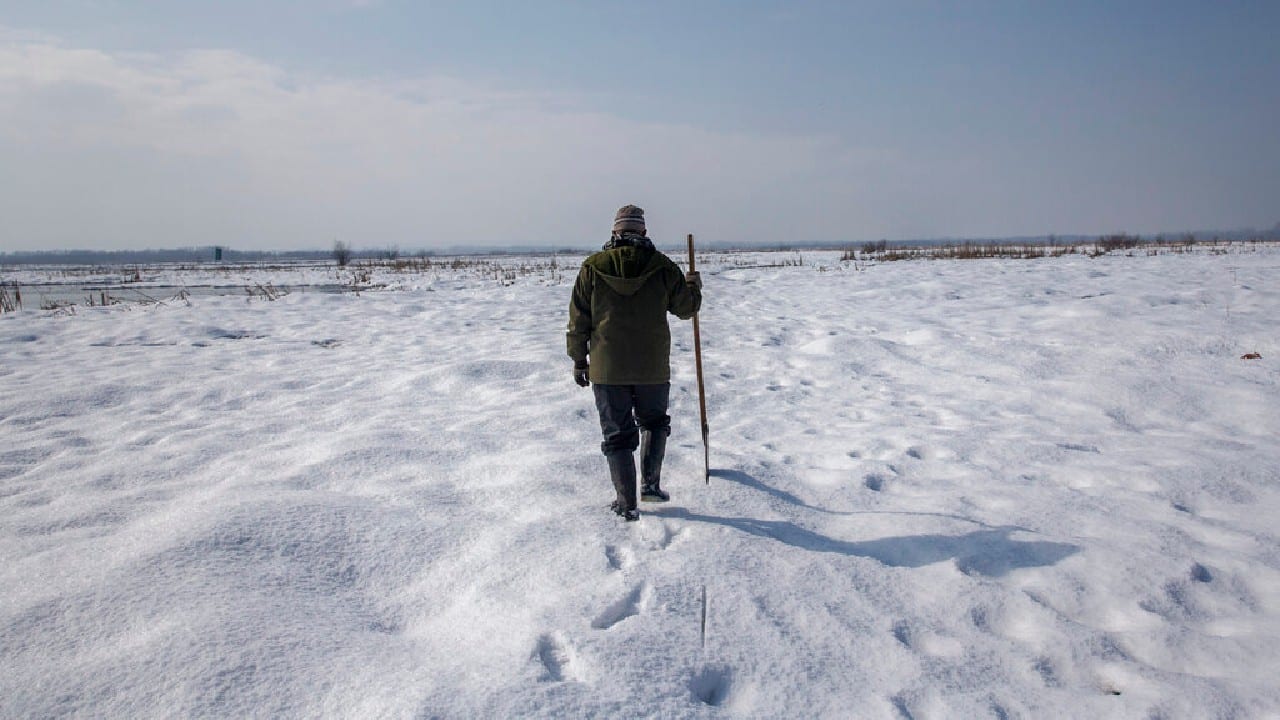 Wildlife official Ghulam Mohiuddin Dar and his colleagues break the ice on a frozen wetland, row their boats, and spread grain to feed migratory birds in Kashmir. (Image: AP)