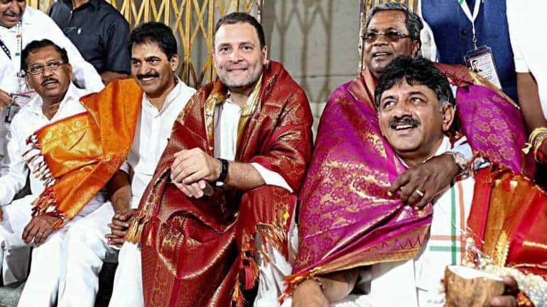 Congress President Rahul Gandhi (C) along with Karnataka Chief Minister Siddaramiah (2nd from R) and other leaders during their visit at Kurudumale Ganesha temple in Kolar, Karnataka on 7th April 2018. (PTI Photo)