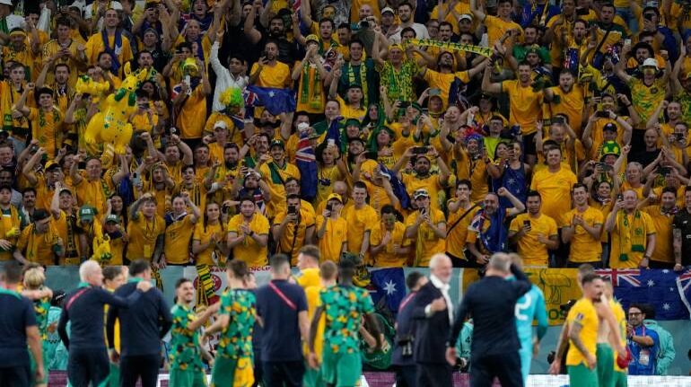 Thousands of Australian fans gathered at Melbourne's Fed Square at 3 am to celebrate team’s win after qualifying for knockouts with win over Denmark on November 30. (Image: AP)