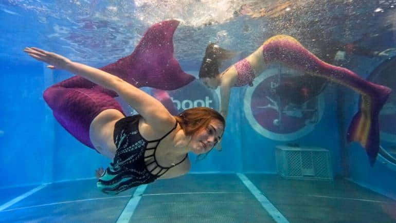 Visitors trying out the so called "mermaiding" free diving with a monofin in a water tank at the boat show for yachts and water sports in Duesseldorf, Germany.