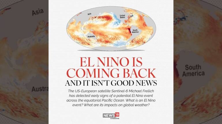 A climate pattern that describes the warming of surface ocean waters in the central and eastern tropical Pacific Ocean. This periodic climate phenomenon can affect weather patterns around the world. (Image: News18 Creative)