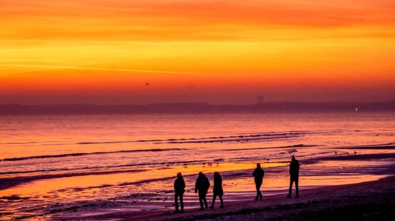 People walk on the beach along the Baltic Sea in Scharbeutz, northern Germany, before sunrise.