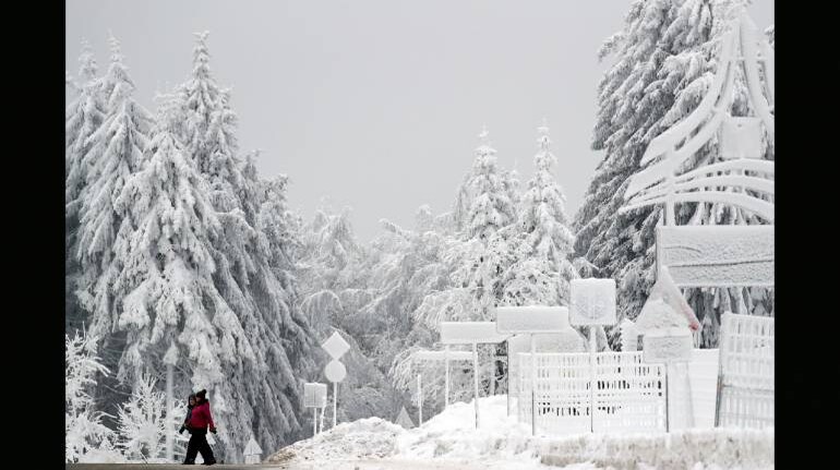 People cross a road in a snow-covered landscape in Oberhof, Germany, on January 7. (Image: AP/Matthias Schrader)