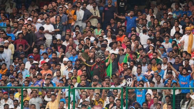 Fans in New Delhi, India, watch the ICC Men's Cricket World Cup match between Afghanistan and England on Sunday. (AP Photo)