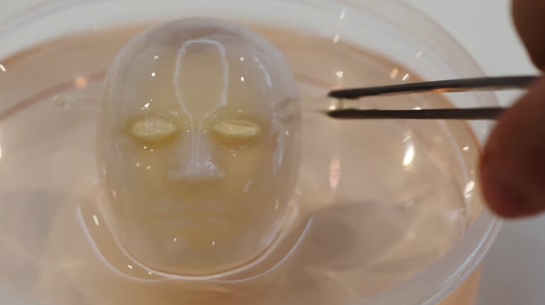 Researchers at the University of Tokyo grew human skin cells in the shape of a face and pulled it into a wide grin, using embedded ligament-like attachments.