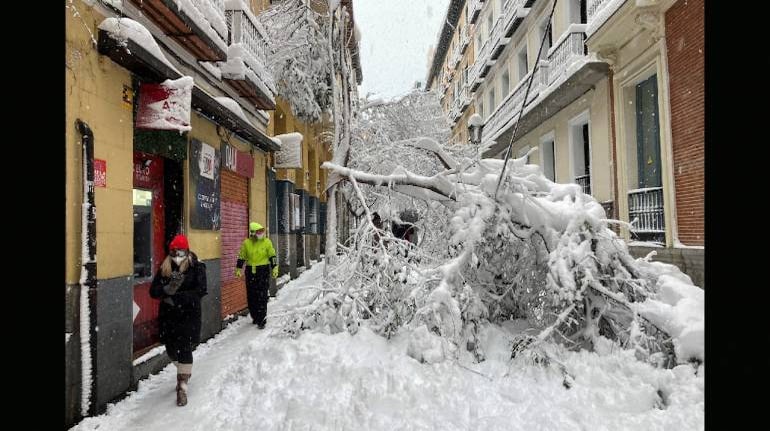 People walk past trees fallen on a street during a heavy snowfall in the centre of Madrid, Spain January 9. (Image: Reuters)