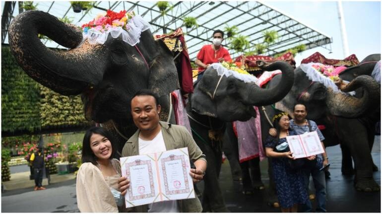 Fifty-nine couples in Thailand got married while riding elephants on February 14, in an annual Valentine’s Day mass wedding ceremony at a botanical garden in a province east of Bangkok. The elephant-back wedding is an annual event at the Nong Nooch Tropical Garden in Chonburi province which usually attracts up to a hundred couples.