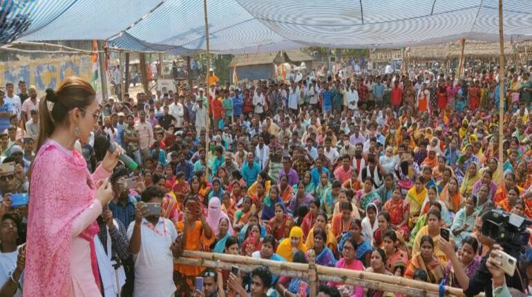 Trinamool Congress MP Mimi Chakraborty at an election rally in West Bengal. Chakraborty is confident the TMC will return for a third term with a 200 plus seats in the assembly elections.