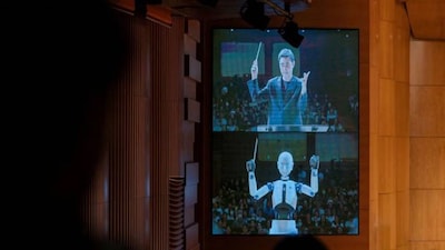 The two-armed robot, designed by the Korea Institute of Industrial Technology, made its debut leading musicians in the country's national orchestra at the National Theater of Korea