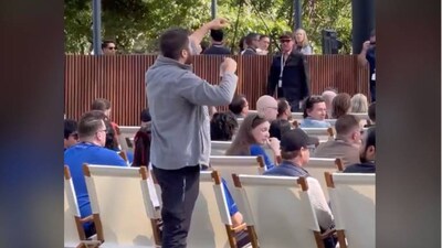 The man walked in from the crowd, shouting something that wasn’t immediately clear. He unzipped his jacket to reveal a keffiyeh and held up what looked like an employee badge.