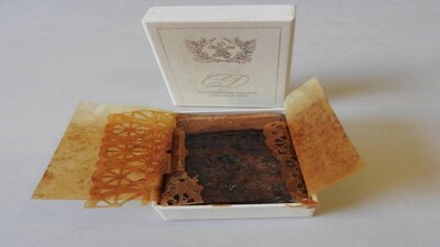 The cake slice was preserved in a white box bearing their initials and wedding date -- July 29, 1981.