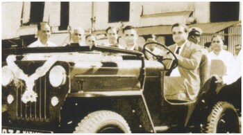 The photograph featured Keshub Mahindra, the chairman emeritus of Mahindra & Mahindra, in 1965 at the wheels of a Willys Jeep in Mazagaon, Mumbai surrounded by many people most likely employees of the company. Mahindra Group had started out as an assembler of Willys Jeeps.