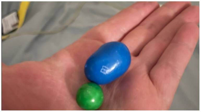 He also shared a photo of the blue M&M, which was almost cylindrical in shape, placed on his palms next to a regular-sized M&M, round, green M&M.