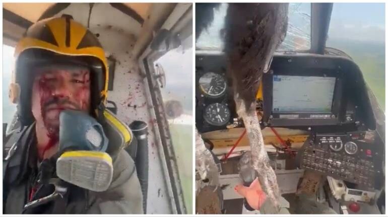 A pilot in Ecuador displayed exceptional composure after an enormous bird crashed through the windscreen into his cockpit and left him covered in blood after which he shot a video of the heart-stopping incident that left spectators in awe.