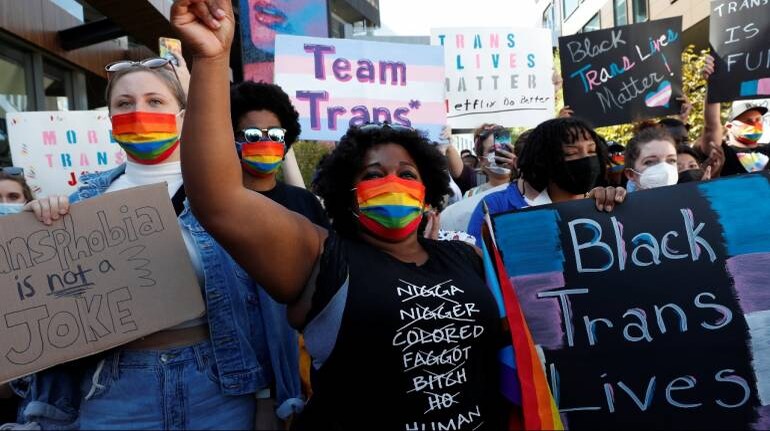 Demonstrators held signs ioutside the Netflix office, proclaiming, “Trans Lives Matter” and “Team Trans” and chanted slogans like “What do we want? Accountability,” “When do we want it? Now.”