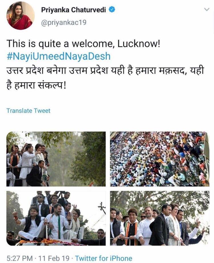 Here goes...corrected...Poor BJP trolls clutching at straws to save their leader’s face in U.P.! This is quite a welcome, Lucknow! #NayiUmeedNayaDesh उत्तर प्रदेश बनेगा उत्तम प्रदेश यही है हमारा मक़सद, यही है हमारा संकल्प! pic.twitter.com/uk0XfpdfcI — Priyanka Chaturvedi (@priyankac19) February 11, 2019