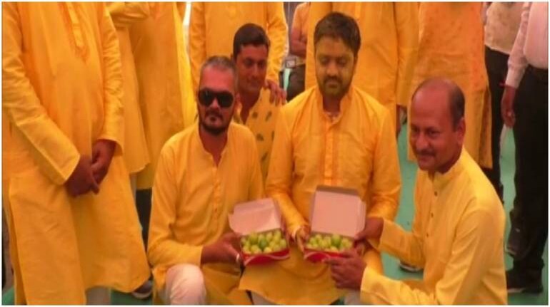 Photos from the “haldi” ceremony, tweeted by news agency ANI, showed the groom flanked by two guests holding boxes full of lemons.