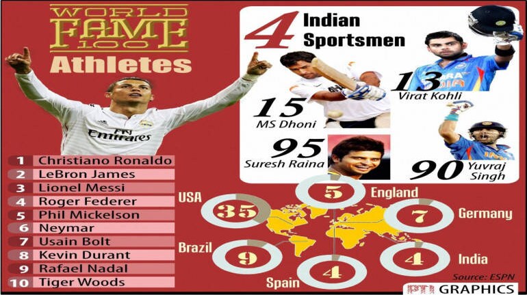 India captain Virat Kohli, former skipper Mahendra Singh Dhoni and stylish left-handed batsmen, Yuvraj Singh and Suresh Raina, have found places in this year's ESPN World Fame 100 list that made its debut last year.