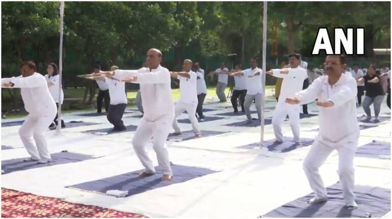 In a video shared by news agency ANI, the ministers can be seen stretching and doing several yoga poses on mats outdoor. Top ministers including Singh and Bhatt attending the event were in all white while others participating in the programme in the rows mostly wore pants and t-shirts.