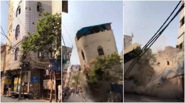 A four-storey building in Delhi's Bhajanpura area collapsed on Wednesday, police officials said. Although the reason for the collapse is yet to be ascertained, a video doing viral on social media shows the building tilting until it finally crashes onto the road, tearing through electric lines and making people flee in panic, screaming.