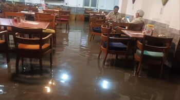 Photos shared by journalists show two lone customers sharing a table over food and drinks in the waterlogged building located in Windsor Place.