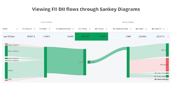 Foreign Institutional Investors and Domestic Institutional Investors have deep pockets, and the amount of money they put in or pull out of the stock market strongly affects index movement. To make the flow of FII and DII money easy to understand, we turned to the Sankey Chart, and the resulting FII/DII Analysis provides a clear picture of daily inflows and outflows of cash from these investors. Green streams are net positive - inflows, while red streams are net negative - outflows.