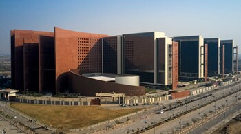 The 4.10 lakh sq. ft building comprises nine floors, including the ground level and three basements. Unlike typical glass, the facade design showcases high-performance glass, also known as DGU (double-glazed unit). Two layers of AAC blocks are used solely on one 600mm-thick west wall, while the remaining walls consist of one layer of AAC blocks with dry cladding of Dholpur stone.