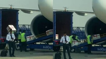 On Wednesday, a Twitter user shared a short clip which show two small brown boxes being offloaded from an airplane. Two IndiGo baggage handlers pick up the boxes and toss them into a parked trailer. The same process is repeated with larger white boxes that arrive in tow.