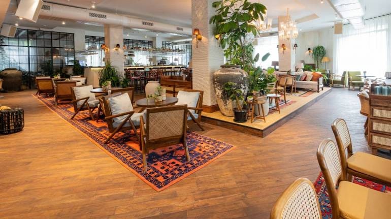 Eve’s eclectic glamour with large comfortable chairs at cosy, sun-kissed corners that have a view of the greens outside, well-lit sophisticated wooden dining tables for families, brick-red, sage green armchairs and invitingly cushioned sofas, pretty plants of all sizes dotted all around the floor, a handsome island bar, all add to its aesthetically done interiors. Needless to say that Eve is great for the gram and even Instagram virgins can go all out, once inside. You can't go wrong with pics when you have interiors like this.