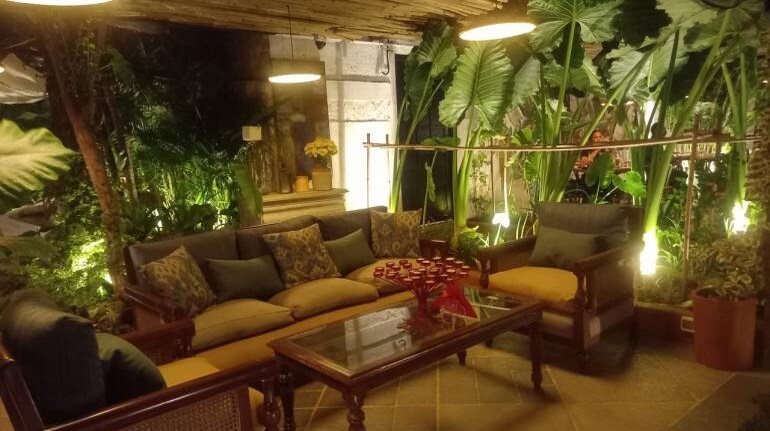 Shrouded in greenery, exuding a tropical vibe, this place offers the ultimate al fresco dining experience. The seating areas are spread across the courtyard – in the pavilion, bar area and in the form of a striking communal table, just outside the display kitchen glass window. The upcycled, but chic furniture, is comfortable and denotes understated elegance. The bright murals on the walls, a la rural Goa, add a pop of colour. Each area is distinct, yet related.