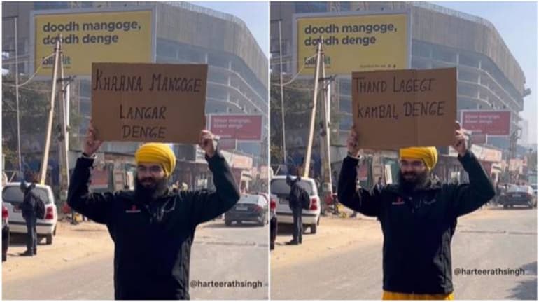 The social activist, Harteerath Singh, shared a video on Instagram of him standing in front of the the Blinkit-Zomato billboards with two banners that read: "Khaana mangoge langar denge (If you ask for food, we'll give you a free meal)" and "Thand lagegi kambal denge (If you feel cold, we'll give you blankets)".