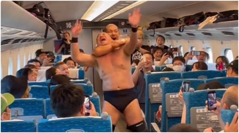 A wrestling match took place aboard a super-fast bullet train in Japan and a video of the same has gone viral online. Two professional wrestlers participated in the WWE-style match organised by Tokya-based DDT Pro-Wrestling in a carriageway full of 75 passengers, BBC reported.