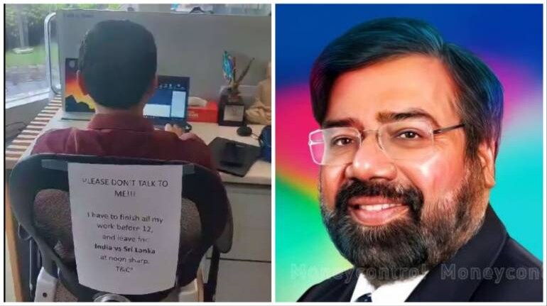 Barring some, all matches in the tournament so far have started at 2 pm in the afternoon and in an example of how the common man is trying to balance both work and watch the match from the stadium, an RPG Group employee was found focussing intensely at work so that he could leave before noon to watch the India-Sri Lanka 2023 ODI World Cup match at the Wankhede Stadium in Mumbai.