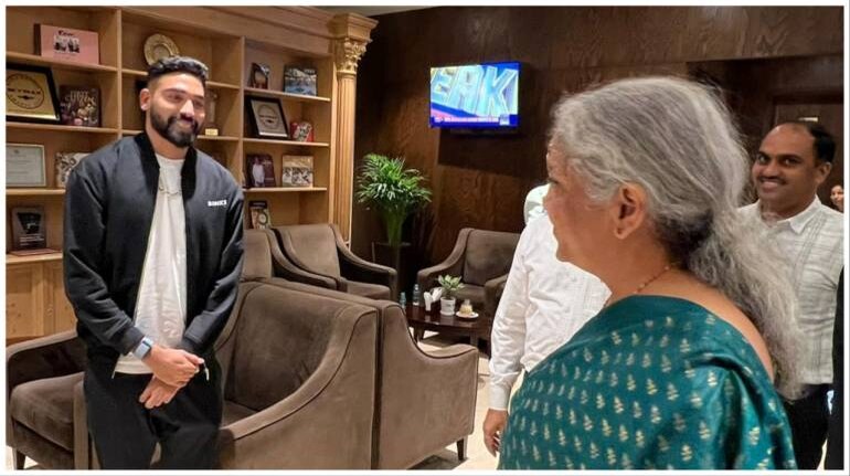 Smt @nsitharaman met Indian cricketer Shri Mohammed Siraj (@mdsirajofficial) at the Rajiv Gandhi International Airport in Hyderabad and congratulated him for the team's stellar performance at the just concluded #CWC23.The Hon'ble Finance Minister noted that the entire team… pic.twitter.com/agd9dstddD