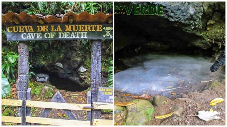 Costa Rica’s Cave of Death (Cueva de la Muerte) is a pool of carbon dioxide on the floor, which is remarkably stable, and nearly 100% CO₂: fatal to every animal that enters the cave.See how a flame can't burn.
