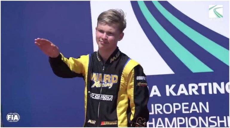 #Russian driver Artyom Severyukhin, competing under the Italian flag at the #European Junior Karting Championship, showed a #Nazi salute at the awards ceremony.He competing under the #Italian flag because of the sanctions imposed on #Russia. pic.twitter.com/q4wOGHPsvR