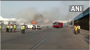 Footage shared by news agency ANI shows the pushback towing vehicle in flames at Delhi airport. Firefighters were filmed dousing the flames just a few feet away from a parked aircraft.