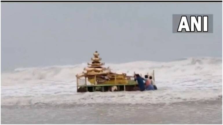 Locals were seen dragging the chariot out of the turbulent sea and bringing it to the shore as many others gathered around to see it. The incident occurred at the Sunnapalli Sea Harbour in Srikakulam district of the coastal state.