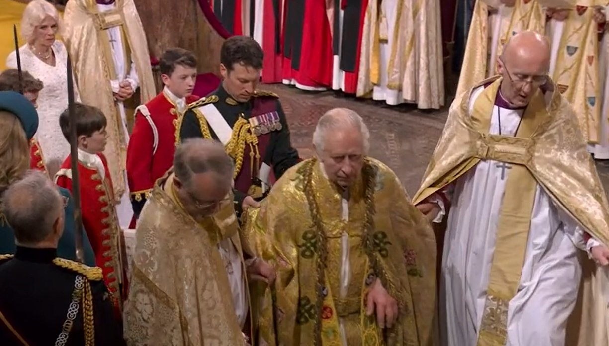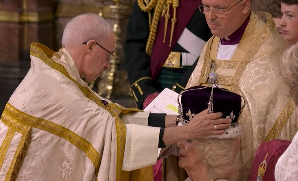 In front of a congregation of about 100 world leaders and a television audience of millions, the Archbishop of Canterbury, the spiritual leader of the Anglican Church, slowly placed the 360-year-old St Edward's Crown on Charles' head as he sat upon a 14th-century throne in Westminster Abbey.