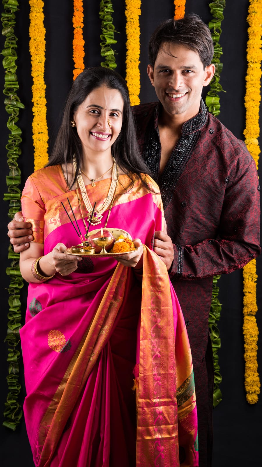 Bright or light-colored clothes are best for the Puja. Avoid black or dark shades as they aren’t considered auspicious.