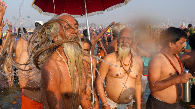 Sadhus take a holy dip at the Sangam on Maghi Purnima, embracing the sacred waters during Maha Kumbh Mela 2025 in Prayagraj. Their devotion fills the air with spiritual energy. (Image: PTI)