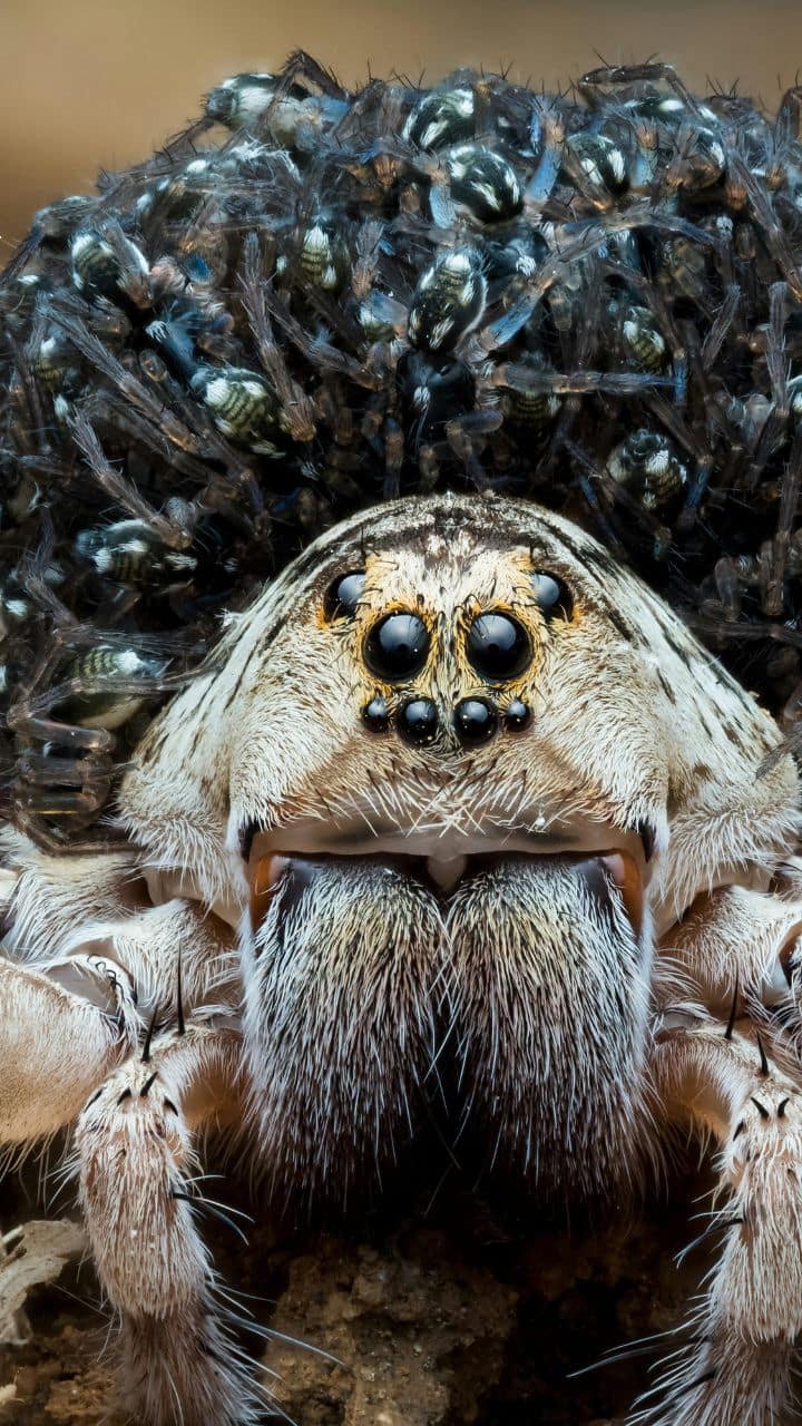 Powerful and fast, wolf spiders don’t spin webs. They chase prey across the ground, carrying egg sacs fearlessly.