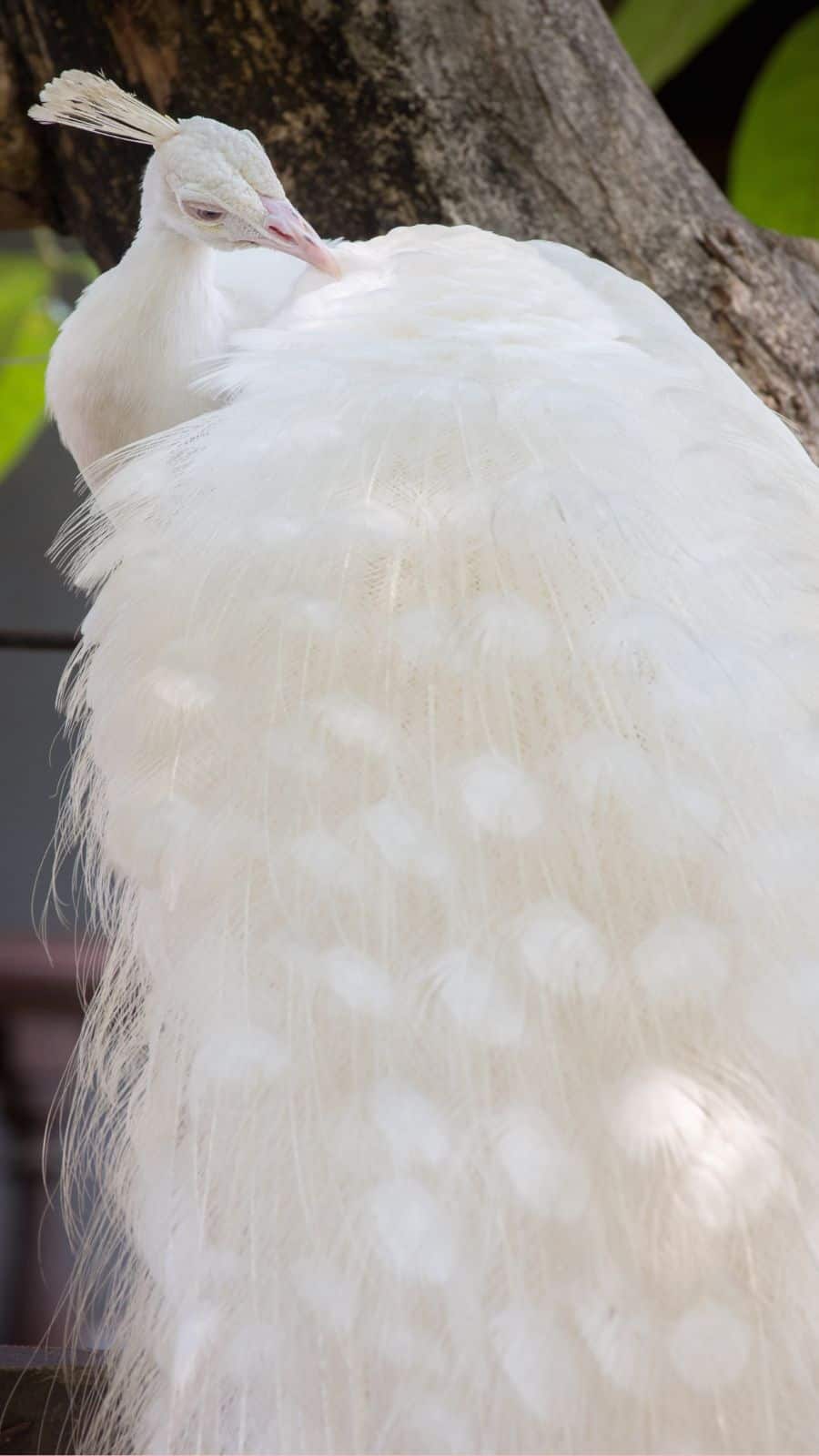 A stunning sight is presented when the white peacock reveals its huge fan of shining, pearl-white feathers.