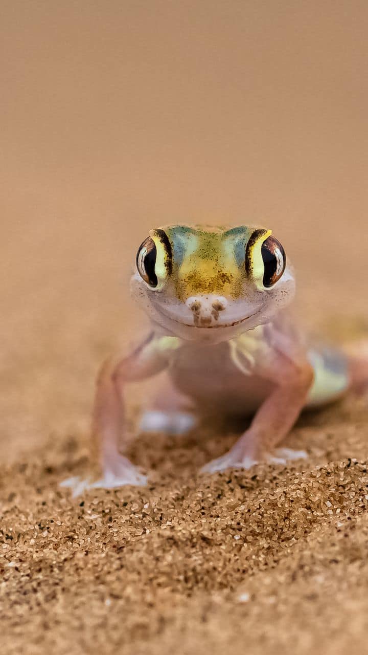 A desert gecko with translucent skin on its toes and belly, blending seamlessly with sand.